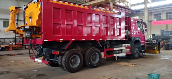多功能除雪車是在ZZ3251M3649W型6*4自卸汽車的基礎(chǔ)上,加裝除雪裝置和融雪劑撒布裝置開發(fā)研制的集多種于一身的特種用途車輛,主要用于道路除雪、運(yùn)輸積雪、渣土(污泥)清運(yùn)等作業(yè),整車結(jié)構(gòu)布局合理,操作方便、簡單、鏟雪和拋灑融雪劑的作業(yè)效率高,調(diào)節(jié)范圍廣,特別適合于國內(nèi)外城市環(huán)衛(wèi)、公路、市政等部門使用。動力強(qiáng)勁、除雪效率高。